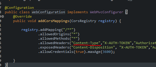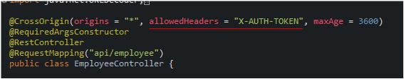 분명 이전포스팅때의 경험을 살려 다음과 같이 @CrossOrigin어노테이션에 받는 입장의 allowedHeaders로 해당 JWT토큰값을 가지고있는 "X-AUTH-TOKEN"헤더를 추가해줬음에도 에러가 발생하였다.