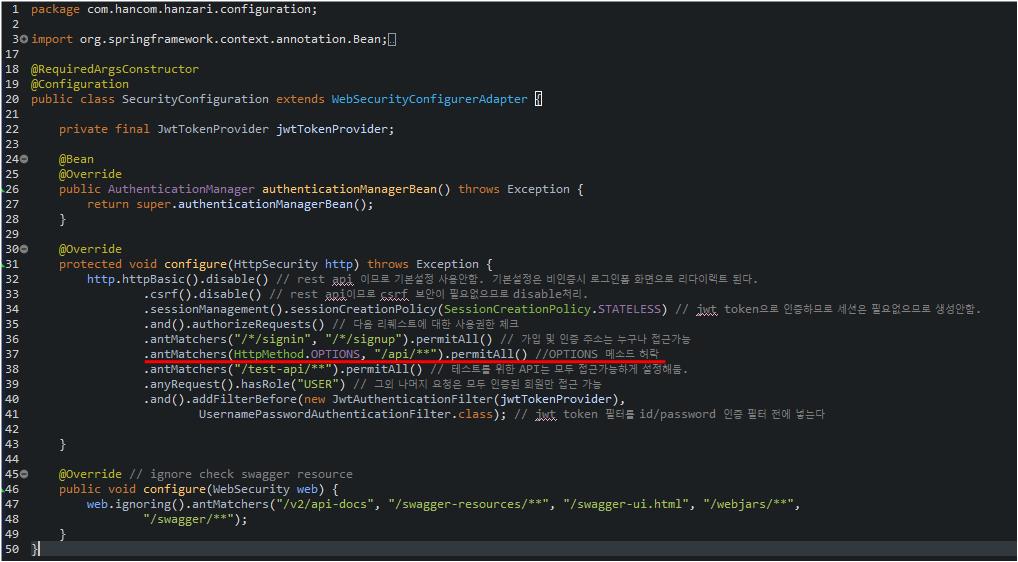 따라서 위 그림의 3번 과정이 행해지게되고 자연스레 그 과정에서 에러가 발생하게 된 것이다. 따라서 OPTIONS 메소드로 날라오는 요청에 대해서는 허용을 해주도록 Filter 옵션을 수정하였다.