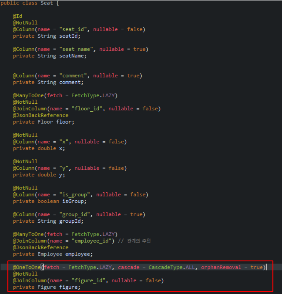 문제가 발생하는 Seat 엔티티 모습이다. fetchType은 DB에서 엔티티 정보를 가져올 때 매핑되어있는 다른 엔티티의 정보를 어느 시점에 가져올지를 정하는 옵션인데, Seat 엔티티 안의 figure 엔티티의 fetchType이 Lazy로 설정되어있었다. (@OneToOne매핑의 default fetchType은 EAGER이다.)