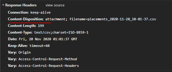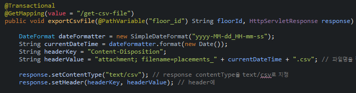 위는 작성한 Controller 코드 중 일부분이다. Content-Disposition 헤더를 추가하여 파일명을 붙여보내는 메소드이고, postman으로 테스트해볼때는 문제가 없었다.