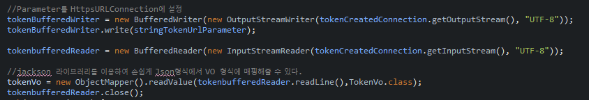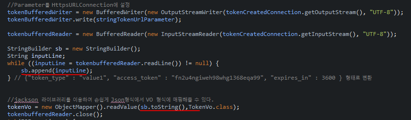 이 형태일때는 tokenbufferedReader.readLine()으로 한 줄을 받아, ObjectMapper를 이용하여 TokenVo를 만들어도 문제가 되지않는다.