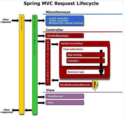 Interceptor는 스프링의 DistpatcherServlet이 컨트롤러를 호출하기 전, 후로 끼어들기 때문에 스프링 컨텍스트(Context, 영역) 내부에서 Controller(Handler)에 관한 요청과 응답에 대해 처리한다. 위의 그림에선 Controller 영역에 존재하는 것 같지만 Controller 외부에 존재하는 녀석이다. 컨트롤러가 처리되기 전과 후에 (preHandle()/postHandle()) 동작하는 게 Interceptor이다. View가 다 처리(화면종료)되고 난 다음에도(afterCompletion()) Interceptor가 실행될 수도 있다. Interceptor는 보통 로그인 체크, 권한체크, 프로그램 실행시간 계산작업 로그확인 처리로 사용된다.